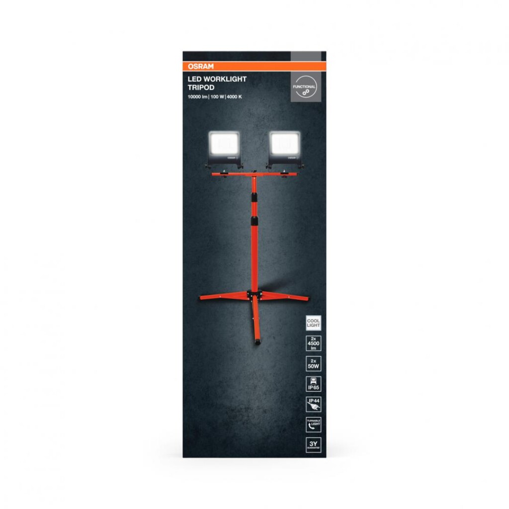2 Proiectoare LED (lampa de lucru) cu stativ OSRAM Worklight Tripod, 2x50W, 220-240V, 2×4500 lm, lumina neutra (4000K), IP65/IK06/IP44, inaltime ajustabila 1.8m, Aluminiu.