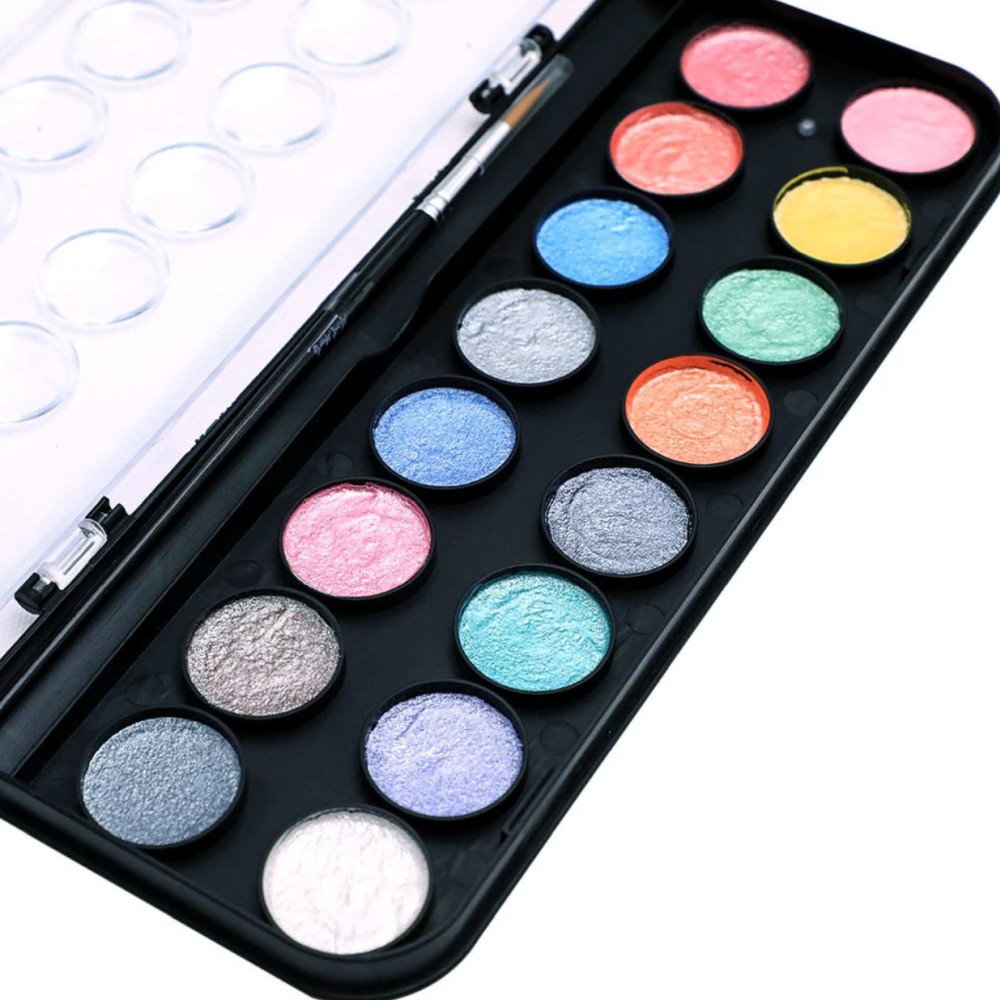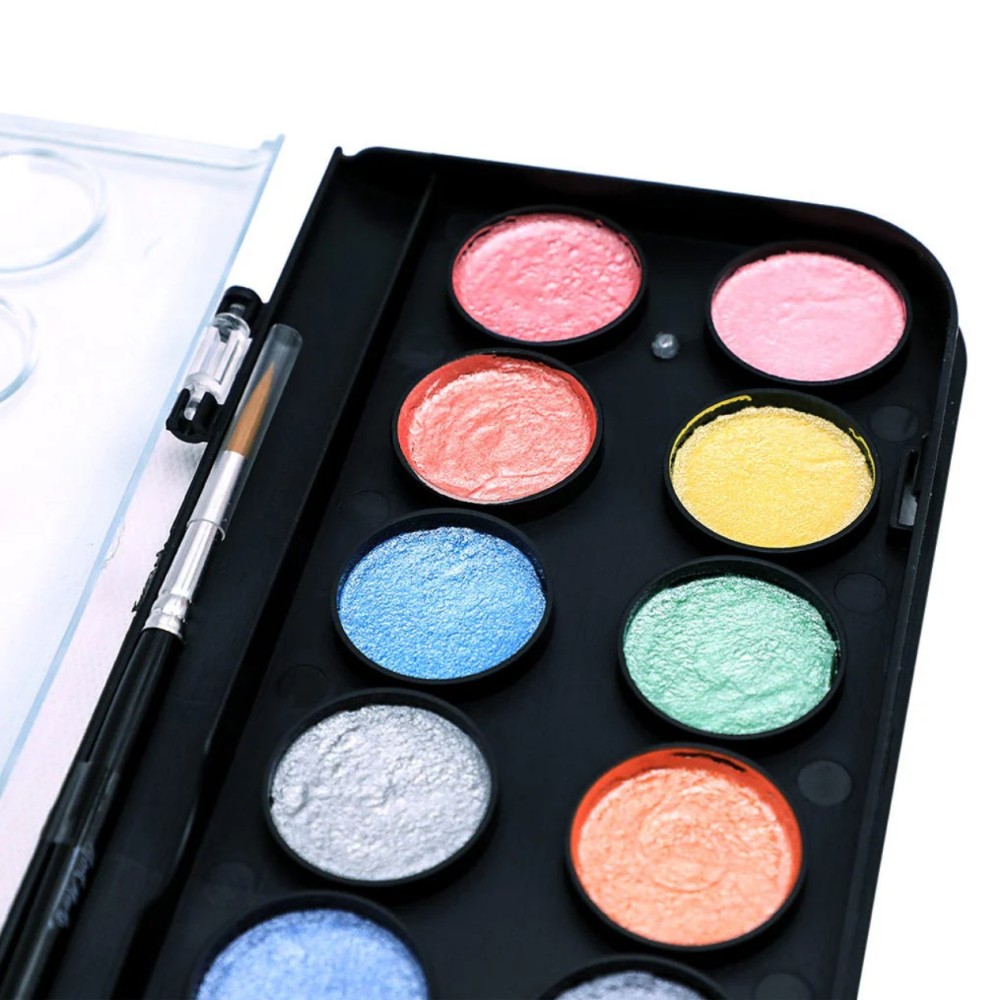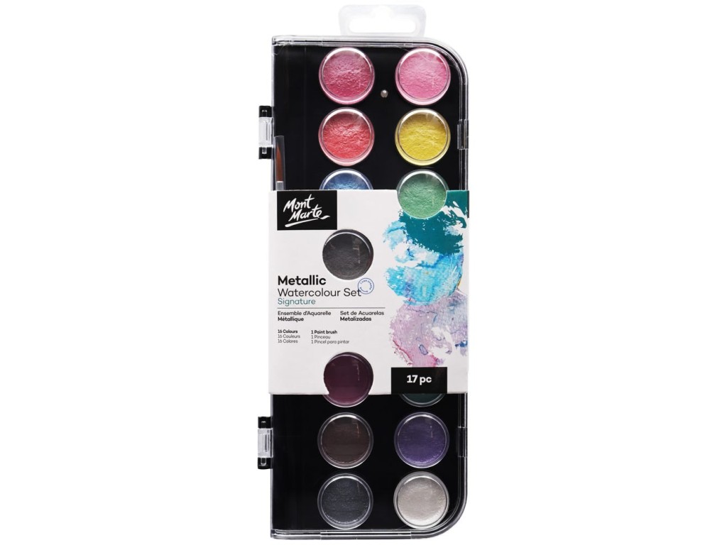 Adaugă un strop de magie și lumină creațiilor tale cu Setul de Acuarele Metalizate Mont Marte – 17 piese! Perfect pentru artiști de toate vârstele, acest set conține 12 acuarele cu efect metalic (12 ml), 1 pensulă, 1 creion, 1 radieră, 1 ascuțitoare și 1 paletă – totul într-un ambalaj practic și estetic.