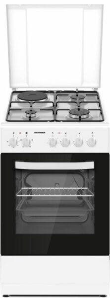 ARAGAZ MIXT HEINNER HFSC-S56E1HSWH, 50X60CM, 3 ARZATOARE GAZ + 1 PLITA ELECRICA, SUPORT EMAIL, CAPAC METALIC, APRINDERE ELECTRICA ARZATOARE, DISPOZITIV DE SIGURANTA ARZATOARE, CUPTOR ELECTRIC, CLASA A, 5 FUNCTII, GRILL, LUMINA CUPTOR, USA CUPTOR CU GEAM DUBLU DETASABIL, DUZE GPL INCLUSE, TAVA SI GRATAR CROMAT, DIMENSIUNI (LXAXI): 50X60X86 CM, CULOARE: ALB.
