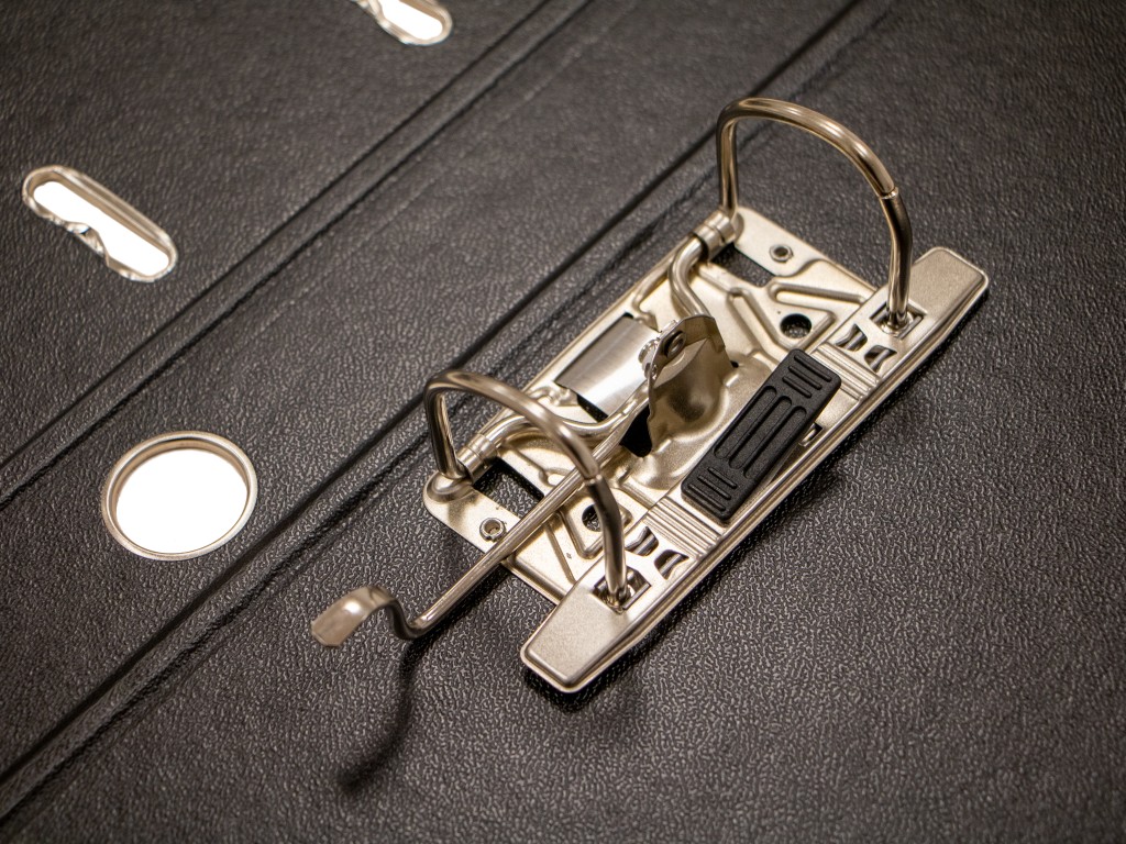 Biblioraft A4. Lățime cotor: 75 mm. Material: carton acoperit cu polipropilenă exterior-interior. Mecanism interior: 2 inele. Fante pe prima copertă