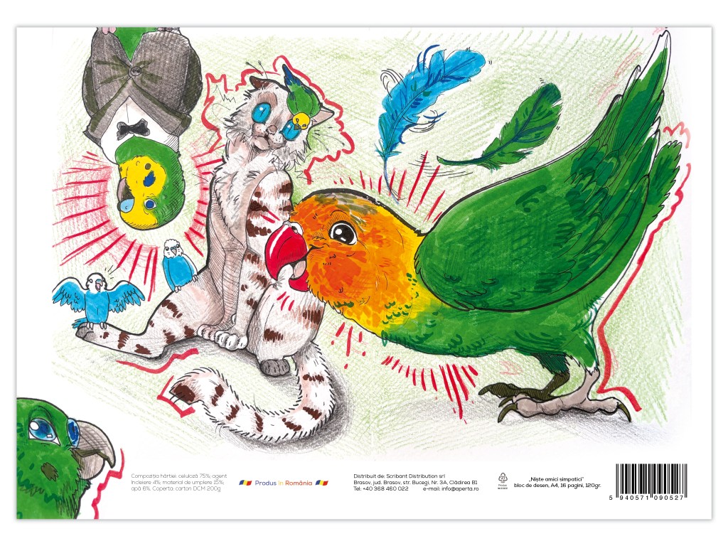 Ilustrația „Niște amici simpatici”, realizată de Nicolescu Mălina, prezintă o pisică singuratică ce își schimbă lumea atunci când întâlnește un grup de papagali plini de energie. Deși la început afecțiunea lor era copleșitoare, treptat descoperă că prietenia poate apărea în cele mai neașteptate forme.