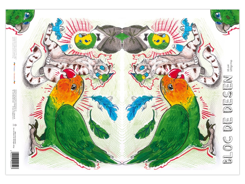 Coperta acestui caiet este o lucrare artistică originală, realizată manual de un elev, fără filtre digitale sau intervenții de inteligență artificială, folosind exclusiv instrumente tradiționale – creion, acuarelă, culori acrilice și markere. Ilustrațiile au fost create cu materiale de desen și culoare aparținând unor branduri consacrate din portofoliul Scribant, precum Schneider, Carioca și Molotow, oferind fiecărei lucrări consistență, expresivitate și o calitate vizuală autentică.
