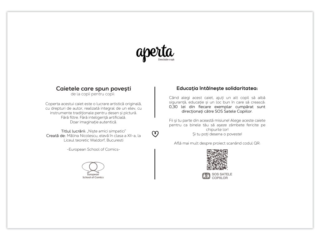 Când alegi acest caiet, ajuți un alt copil să aibă siguranță, educație și un loc bun în care să crească – 0,30 lei din fiecare exemplar cumpărat sunt direcționați către SOS Satele Copiilor.