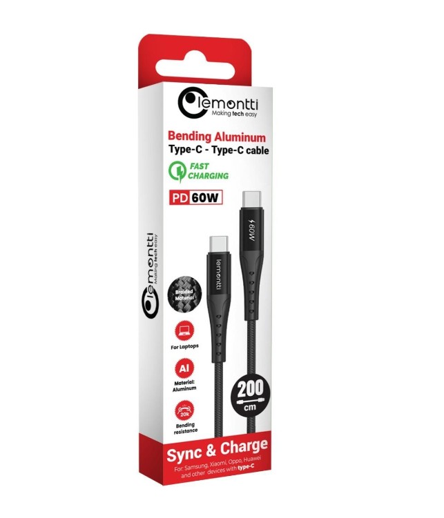Cablu Lemontti Bending Aluminum Type-C la Type-C, Fast Charge, PD 60W, 2m, Negru.