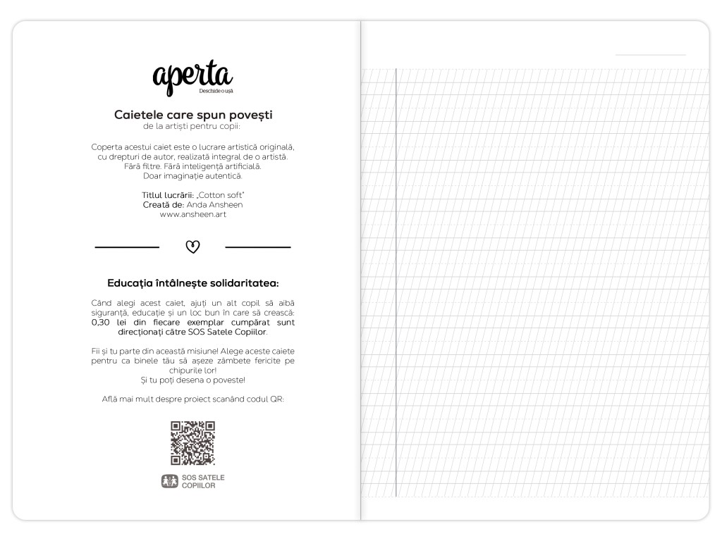 Când alegi acest caiet, ajuți un alt copil să aibă siguranță, educație și un loc bun în care să crească – 0,30 lei din fiecare exemplar cumpărat sunt direcționați către SOS Satele Copiilor.