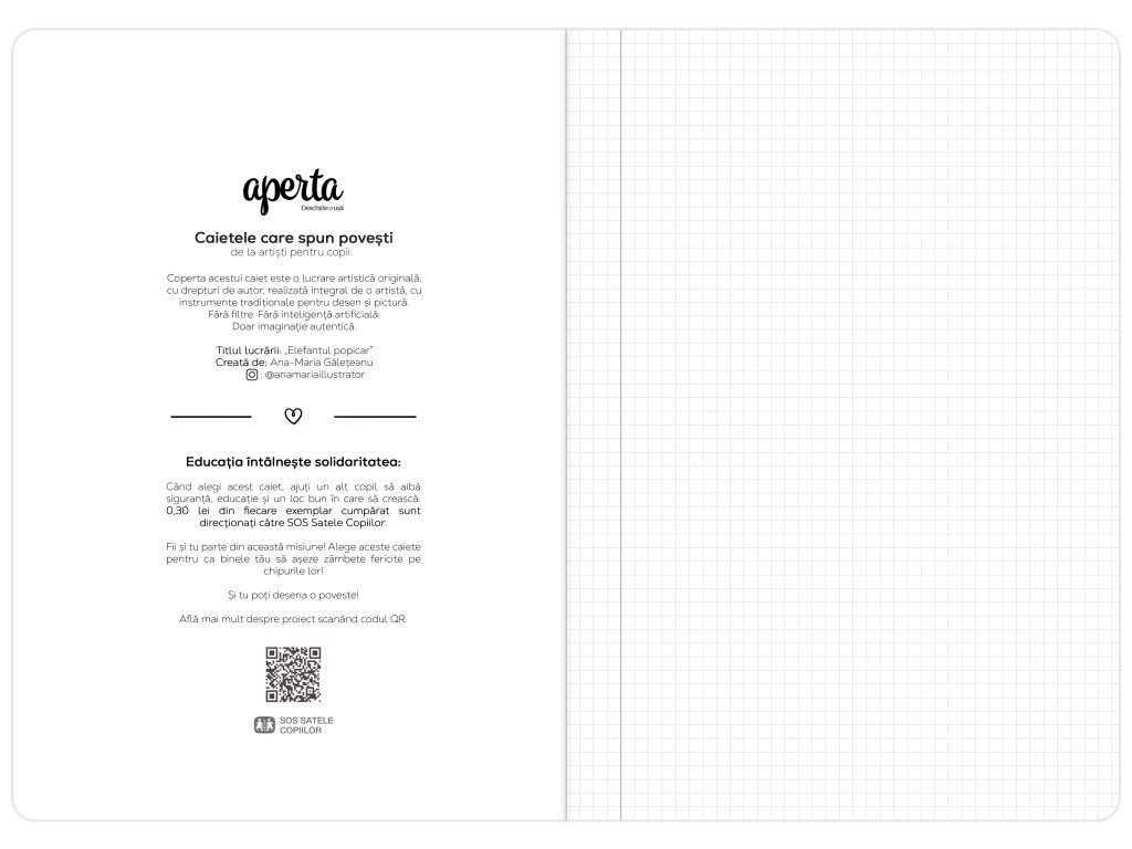 Când alegi acest caiet, ajuți un alt copil să aibă siguranță, educație și un loc bun în care să crească – 0,30 lei din fiecare exemplar cumpărat sunt direcționați către SOS Satele Copiilor.