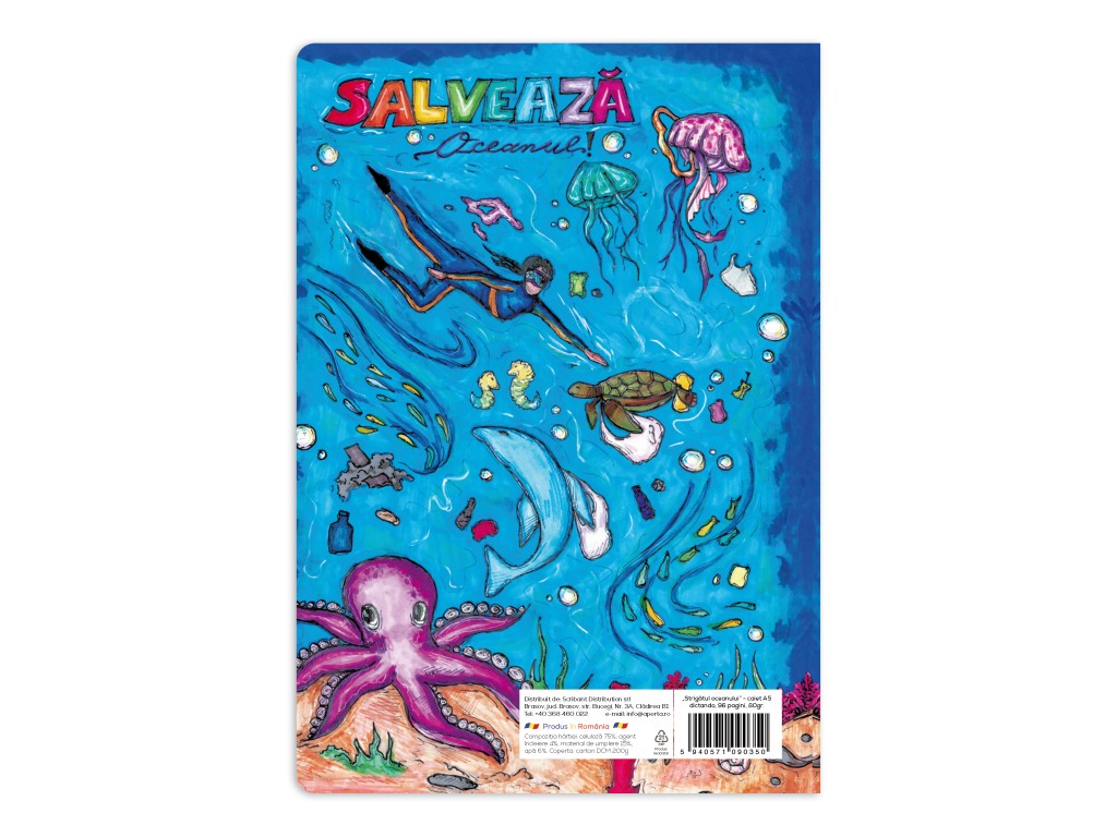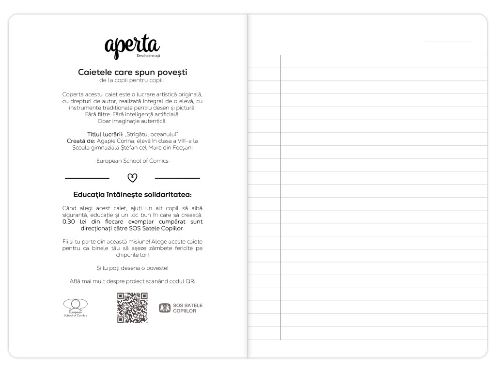 Când alegi acest caiet, ajuți un alt copil să aibă siguranță, educație și un loc bun în care să crească – 0,30 lei din fiecare exemplar cumpărat sunt direcționați către SOS Satele Copiilor.