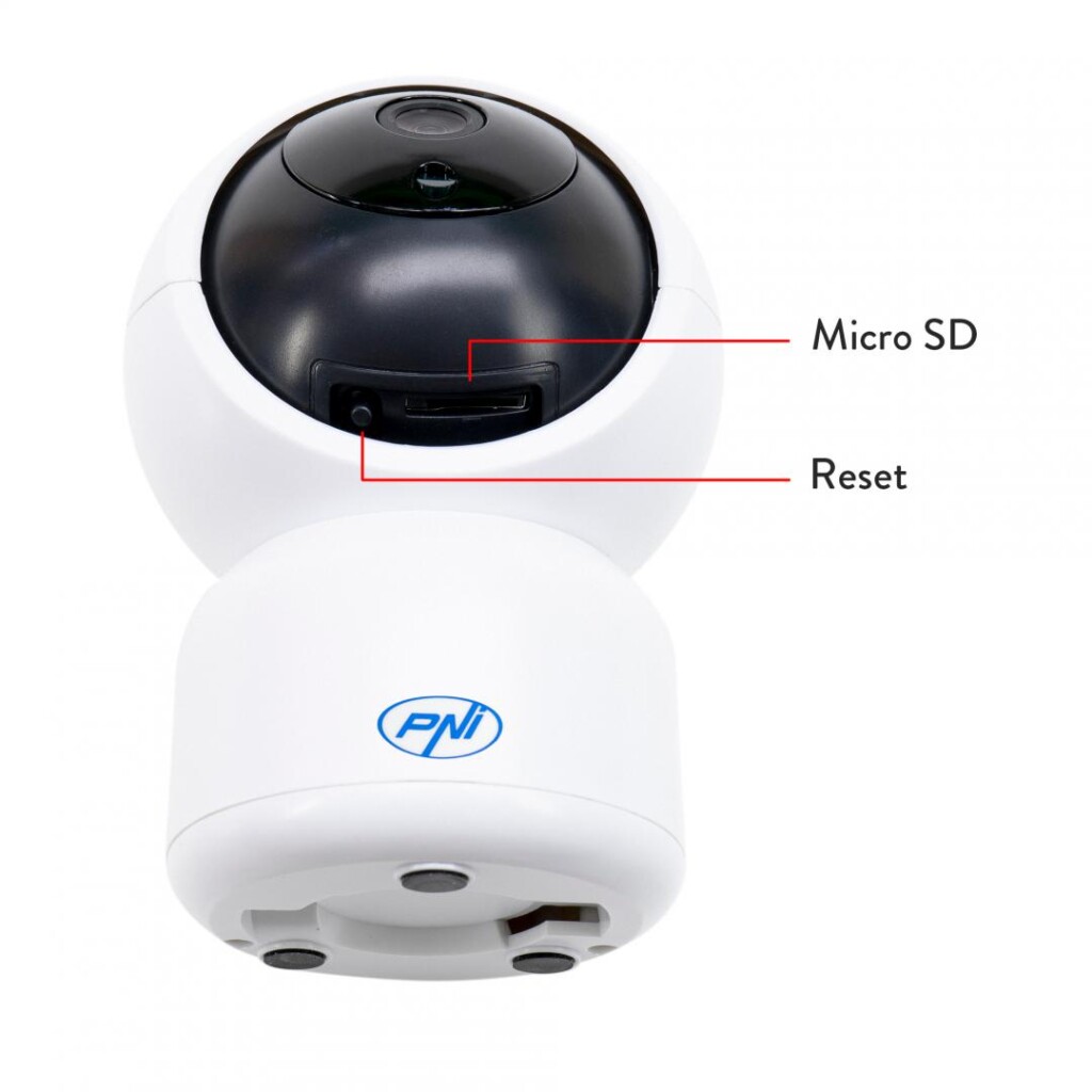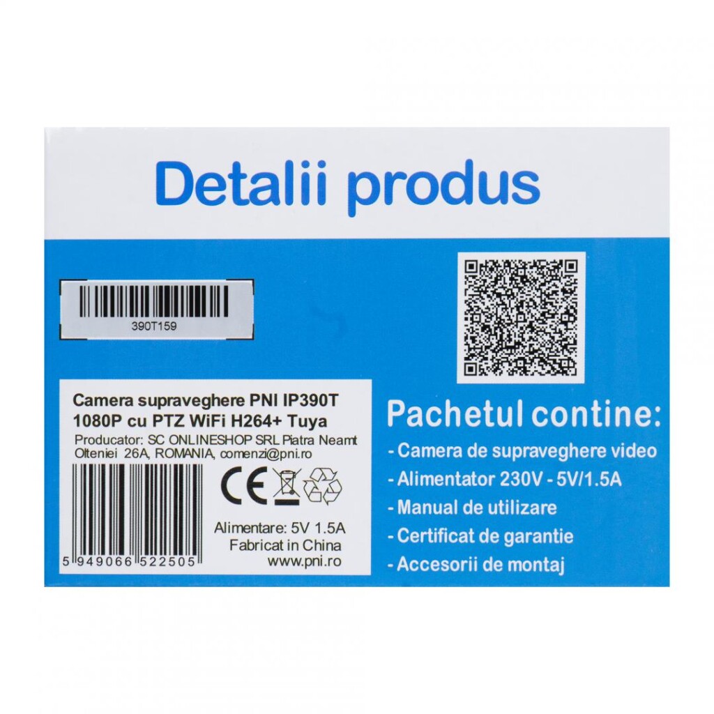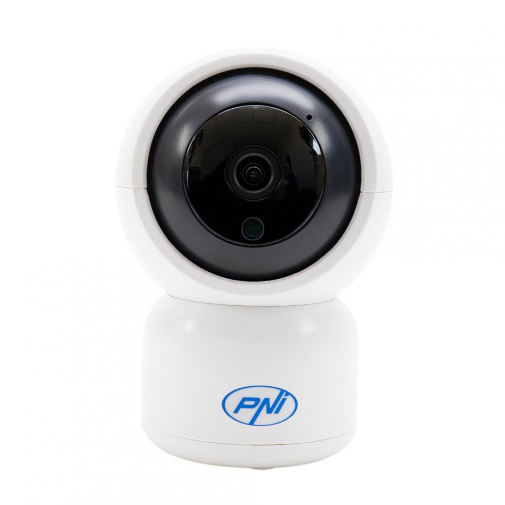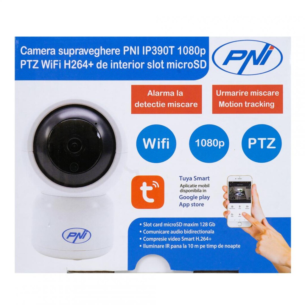 Camera supraveghere video PNI IP390T 1080P cu PTZ WiFi H264+ suporta microSD 128GB, Night Vision, aplicatia Tuya, P2P, Android, iOS, pentru interior, rotire dupa miscare, alarma la miscare, Senzor imagine: 1/2.9″ CMOS F37, 2MP, Rezolutie: 1080P (1280 x 1080), Lentila: 3.6mm, Compresie: H.264+, Microfon integrat, Difuzor integrat, Retea: 10/100 Mbps RJ-45, Wireless: 2.4 Ghz 802.11b/g/n, MicroSD maxim 128GB (cardul nu este inclus), IR:pana la 10 m.