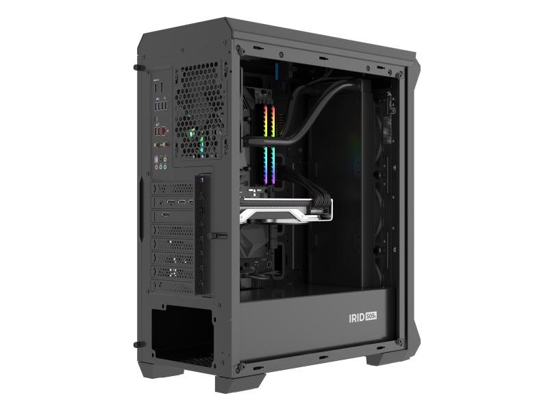 Carcasa GENESIS IRID 505F Mid Tower NEGRU, Tempered Glass, Sloturi Expansiune 8, Drive Bays: 2×3.5″ 7×2.5″, Ventilatoare Suportate: 6 (spate: 1x120mm, fata: 3x120mm sau 2x140mm, sus: 2x120mm sau 2x140mm), Ventilatoare Incluse: 5 (sus: 1x120mm, fata: 3x120mm, spate: 1x120mm), Format Placa De Baza Suportat: Mini-ITX, Micro-ATX, ATX, Lungime Maxima Placa Video: 380mm, Inaltime Maxima Cooler Procesor: 165mm.