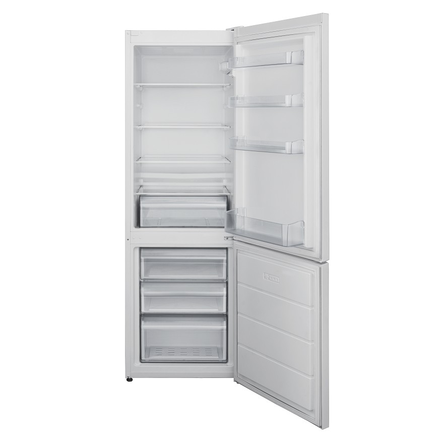 Combina frigorifica Heinner HC-V268F+, Clasa energetica: F, Sistem de racire Less Frost, Capacitate totala: 268L, Capacitate frigider: 184L, Capacitate congelator: 84L, Control mecanic cu termostat ajustabil, Lumina LED, Functie „Super congelare”, 3 rafturi sticla frigider, 3 sertare congelator, Compartiment pentru fructe si legume, Usi reversibile, Suport oua, Tavita cuburi de gheata, Capacitate congelare: 3.9kg/24h, Dimensiuni (WxDxH): 54 x 59.5 x 170 cm, Alb cu decoratiune cromata pe maner.