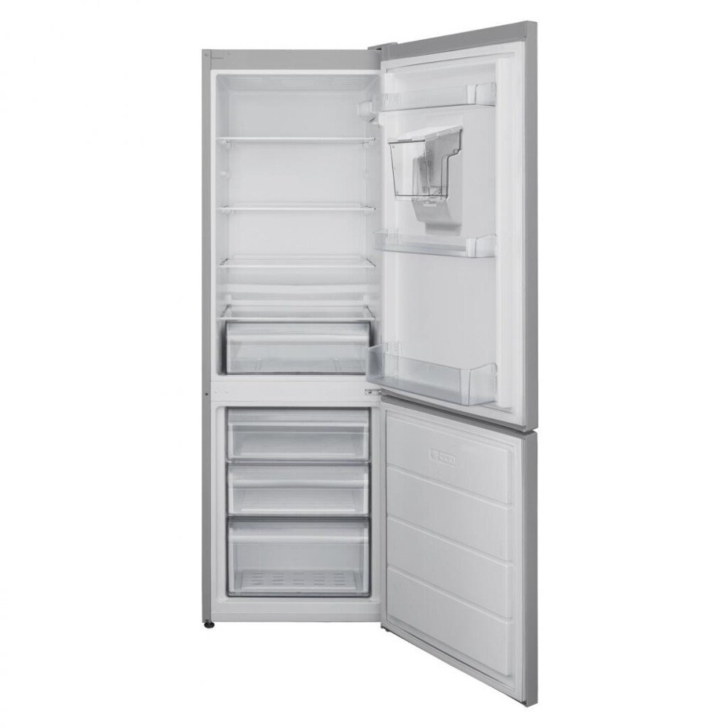 Combina frigorifica Heinner HC-V270SWDF+, clasa energetica: F, Sistem de racire Less frost, capacitate totala: 268L, capacitate frigider: 184, capacitate congelator: 84L, control mecanic cu termostat ajustabil, lumina LED, functie „Super congelare”, 3 rafturi sticla frigider, 3 sertare congelator, compartiment pentru fructe si legume, dozator de apa, dimensiuni (WxDxH): 54 x 59.5 x 170 cm, argintiu.