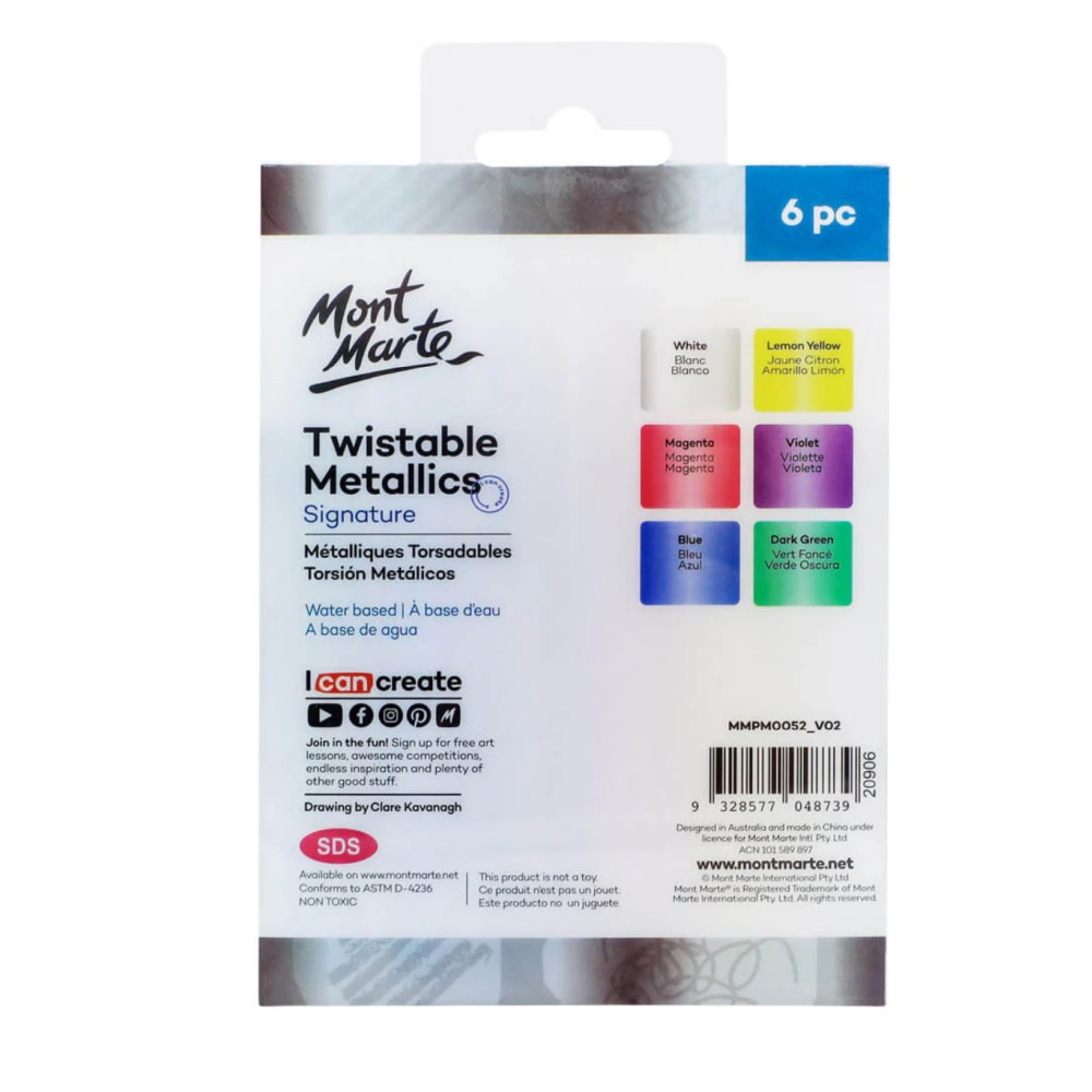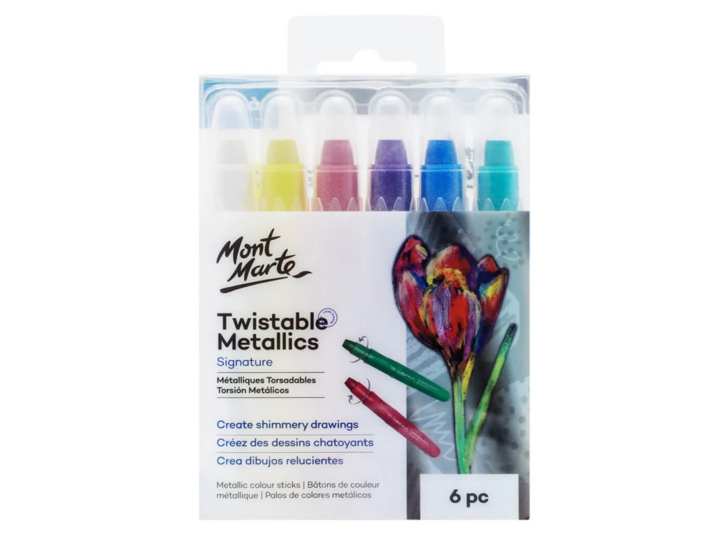 Creioane retractabile metalizate Mont Marte, 6 bucăți (cunoscute și ca Twistable Metallics Signature 6pc) – stick-uri gel retractabile cu efect metalic strălucitor, perfecte pentru coloring, layering și efecte shimmer!