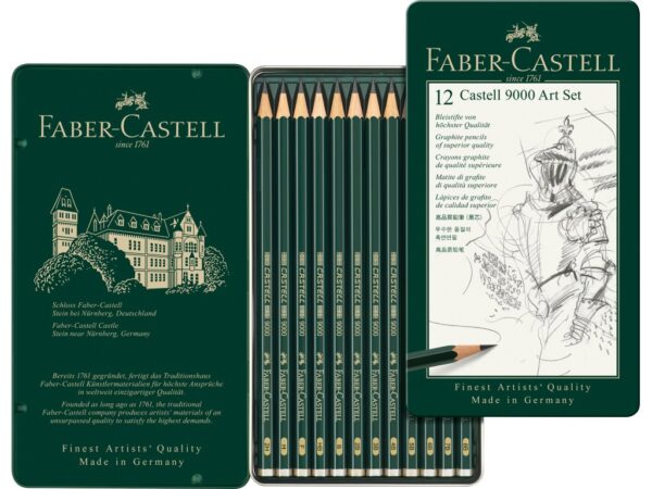 Setul conține 12 creioane Castell 9000 (8B, 7B, 6B, 5B, 4B, 3B, 2B, B, HB, F, H, 2H) într-o cutie de metal.