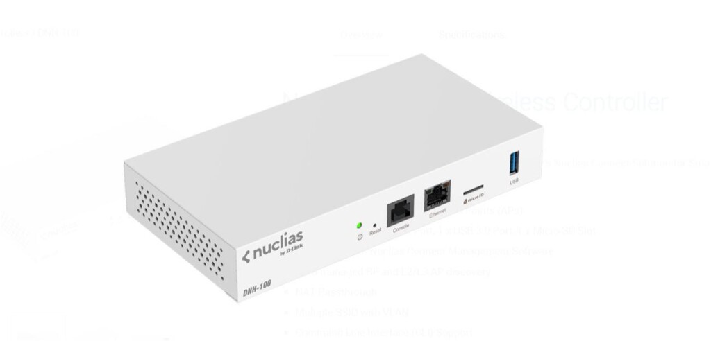 D-link Nucillas wireless controller DNH-100, Manages up to 100 Wireless Access Points (APs), 1 x 1000 Base-T Ethernet Port, 1 x USB 3.0 Port, 1 x Micro SD Slot, Pre-loaded with Nuclias Connect Management Software, WPA2/WPA3 Support, IEEE 802.3ab/u/x Support, Single Sign-On, Console Port RJ45, 1x USB port.
