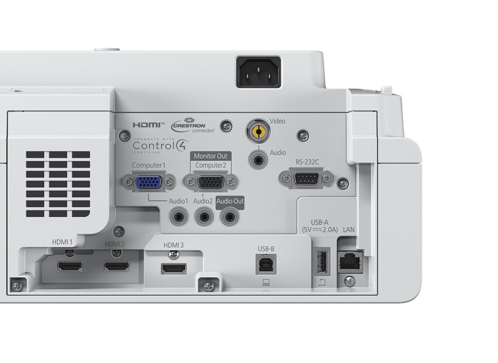 EPSON Proiector Laser EB-760W, Tehnologie 3LCD, Display LCD 0.59″, 4100 Lumeni, Rezolutie: WXGA HD ready, Rata aspect: 16:10, Contrast: 2.500.000: 1, Sursa lumina: Laser, Durata de viata sursa lumina: 20.000h, 30.000h mod ECO, Refresh rate: 100 Hz – 120 Hz, Dimensiune proiectare: 60″-150″, Interfata: USB 2.0-A (2x), RS-232C, Ethernet interface (100 Base-TX / 10 Base-T), Wireless LAN IEEE 802.11a/b/g/n/ac, VGA in (2x), VGA out, HDMI in (3x), Composite in, Miracast, Jack plug out, Jack plug in (3x), USB 2.0 Type B (Service Only), Wi-Fi Direct, Microphone input, Dimensiuni: 356 x 395 x 133 mm, greutate 5,9 kg, Culoare: alb, Difuzor incorporat 16w.