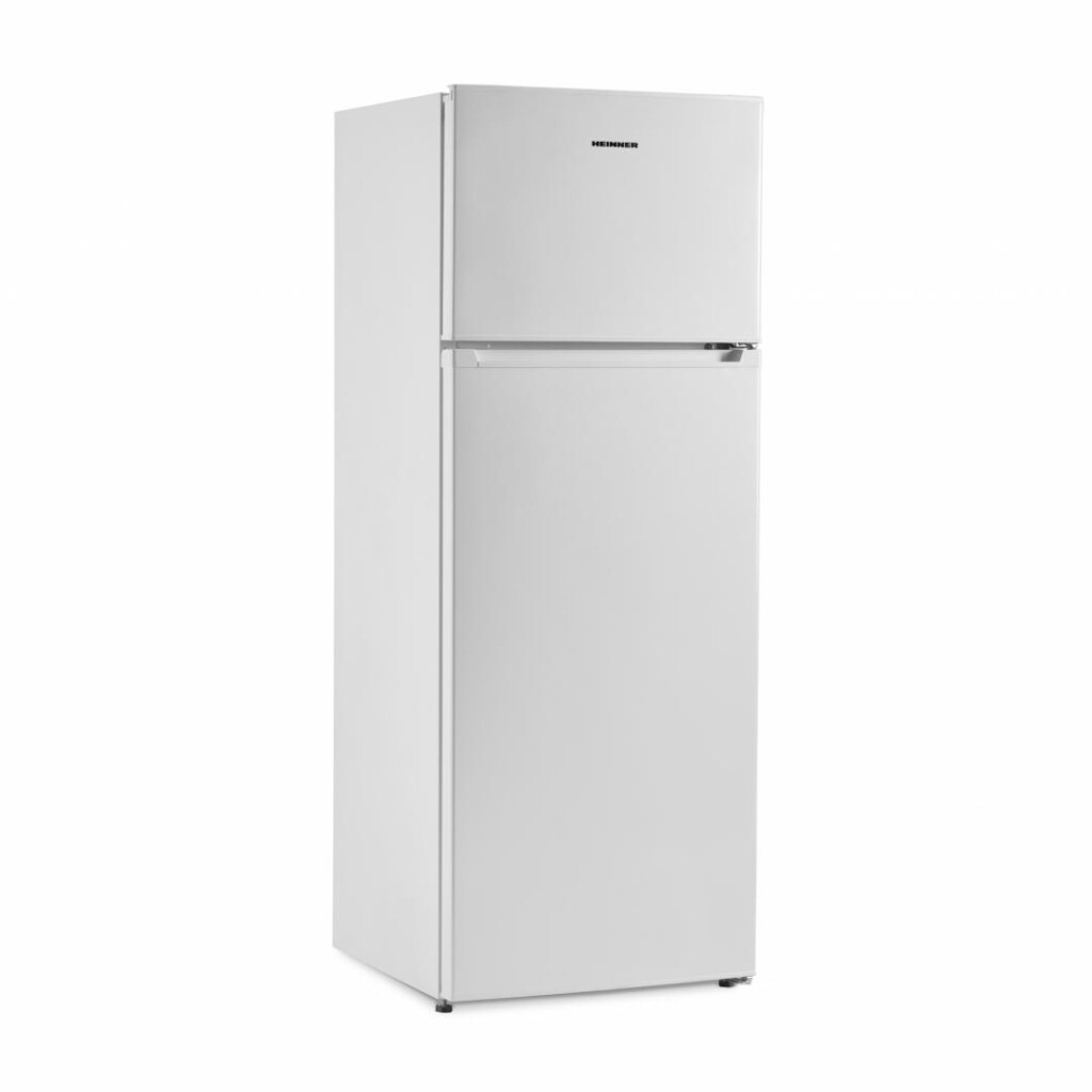 Frigider cu doua usi Heinner HF-V213F+, clasa energetica: F, Sistem de racire Less Frost, capacitate totala: 212L, capacitate frigider: 171L, capacitate congelator: 41L, control mecanic cu termostat reglabil, lumina LED, 3 rafturi din sticla, compartiment pentru fructe si legume, suport oua, recipient cuburi de gheata, usi reversibile, suport de oua, tavita cuburi de gheata, capacitate congelare: 2.6kg/24h, dimensiuni (WxDxH): 54 x 57 x 144 cm, culoare: Alb.