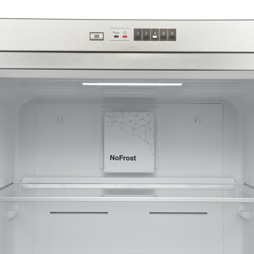 Frigider cu o usa Heinner HF-V401NFXF+, Full No frost, clasa energetica: F, capacitate totala: 389L, control electronic, lumina LED, functie Super racire, 4 rafturi sticla, 1 compartiment pentru fructe si legume cu control nivel umiditate, 1 compartiment Chiller, suport oua, dimensiuni (WxDxH): 59.5 x 65 x 186 cm, culoare: Aspect inox.