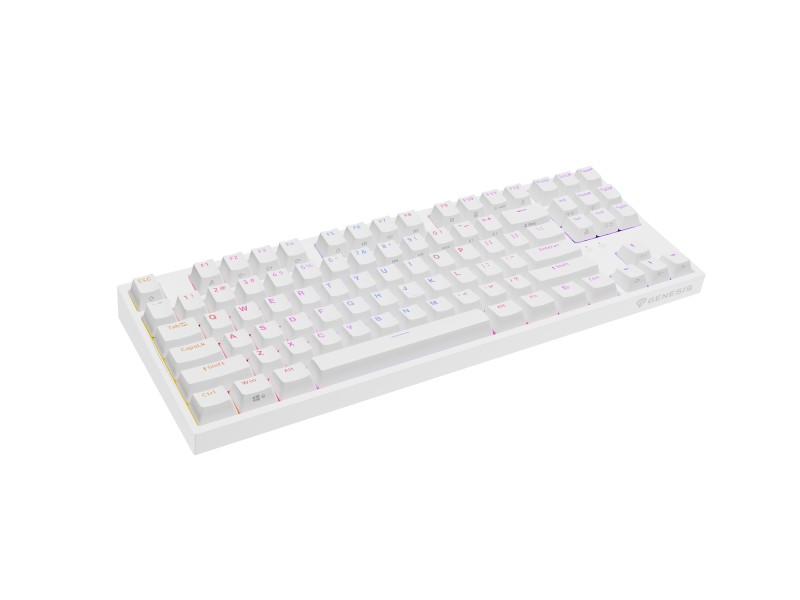 GENESIS Thor 404 TKL. Keyboard form factor: Tenkeyless (80 – 87%). Keyboard style: Straight. Connectivity technology: Wired, Device interface: USB, Keyboard key switch: Mechanical, Keyboard layout: QWERTY, Keyboard number of keys: 87. Backlight type: RGB LED. Cable length: 1.8 m. Recommended usage: Gaming. Product colour: White.