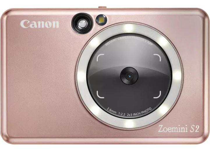 Imprimanta foto Canon Zoemini S2, 2 in 1 camera foto + imprimanta foto, tehnologie ZINK (zero ink) Viteza: 50 secunde pe poza, Rezolutie printare 314 X 600 dpi, Camera 8 megapixeli, blitz integrat, Bluetooth, NFC, compatibilitate IOS si Android, format poze: JPG, slot microSD (max256gb), baterie 700mAh, durata baterie: 25 tipariri, dimensiuni: 121 x 80.3 x 22.4 mm, culoare: Rose Gold, greutate: 188g, capacitate 10 coli 5.08 x 7.62 cm.