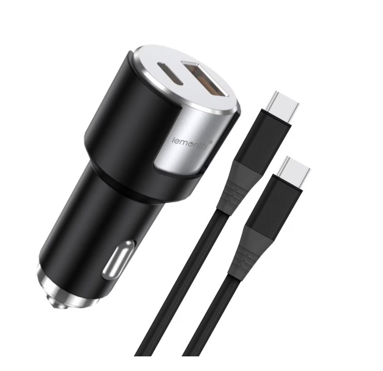Incarcator auto Lemontti Fast Charge 1 x port PD Type-C 20W + 1 x port USB-A QC 3.0 18W cu cablu Type-C la Type-C 20W, lungime 1m, Negru/Argintiu.