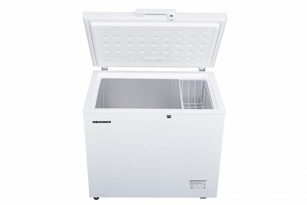 Lada frigorifica Heinner HCF-246CNHF+, convertibila, clasa energetica: F, capacitate totala: 246L, control electronic, rezistenta la frig (opereaza la temperaturi scazute: -15°C), rezistenta la variatii de tensiune 175~255V, display rezistent la apa, lumina LED, functie congelare rapida, 1 cos, decongelare manuala, role pentru transportare usoara, capacitate de congelare: 12kg/24h, dimensiuni (WxDxH): 95.4 x 61.6 x 84.5 cm, culoare: alb.