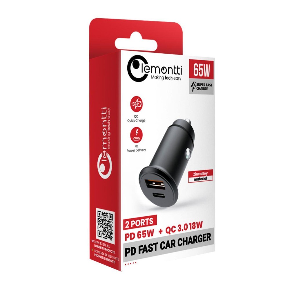 Lemontti Incarcator Auto Super Fast Charge 65W 2 porturi PD Type-C 65W + USB-A QC 3.0 Negru