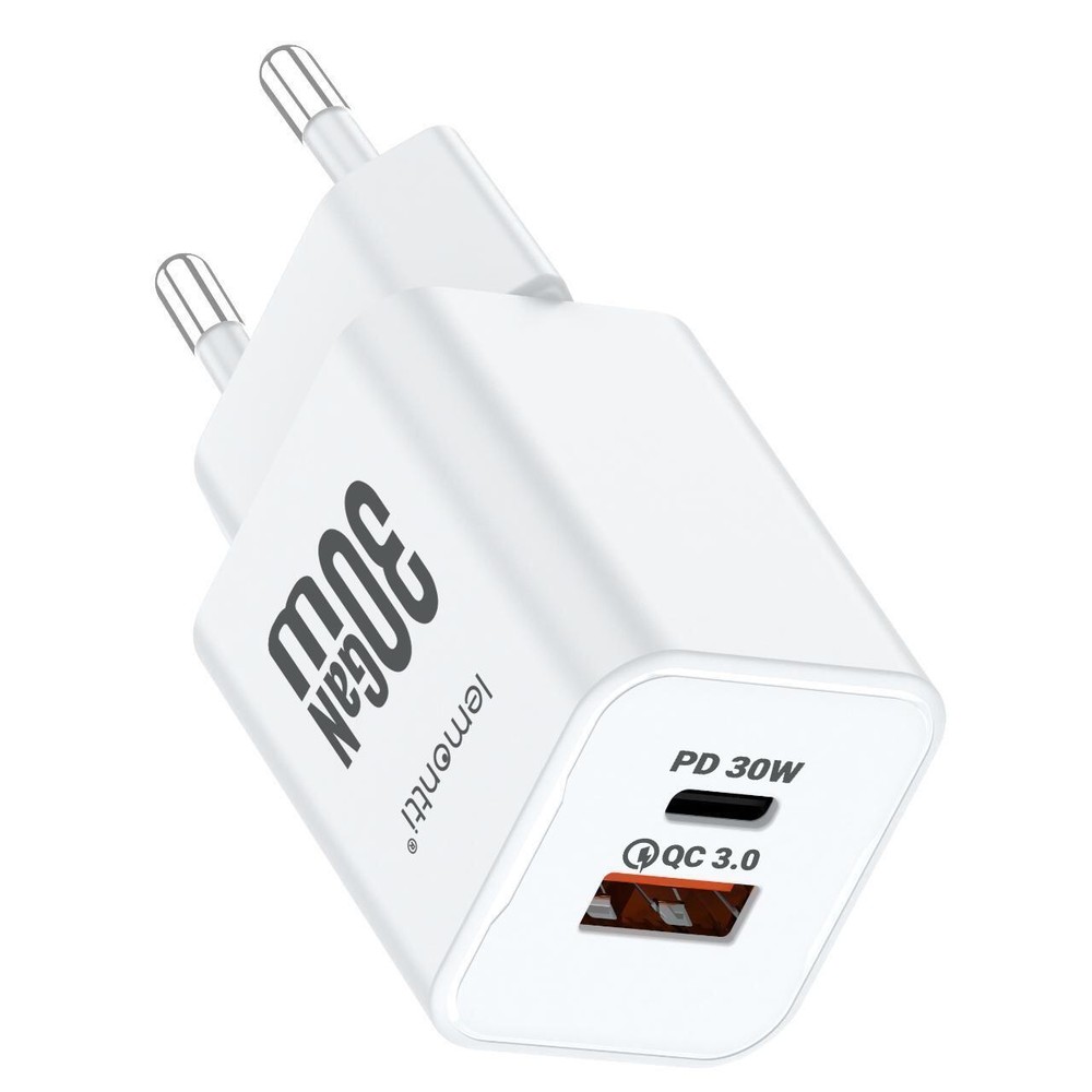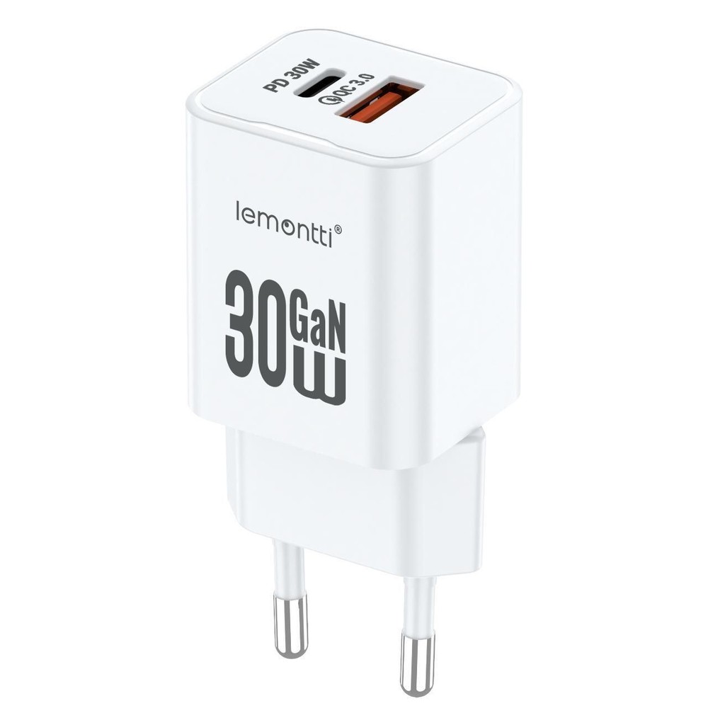 Lemontti Incarcator Retea GaN Dual Port 1x Type-C si 1x USB-A, 30W, EU Plug, Alb