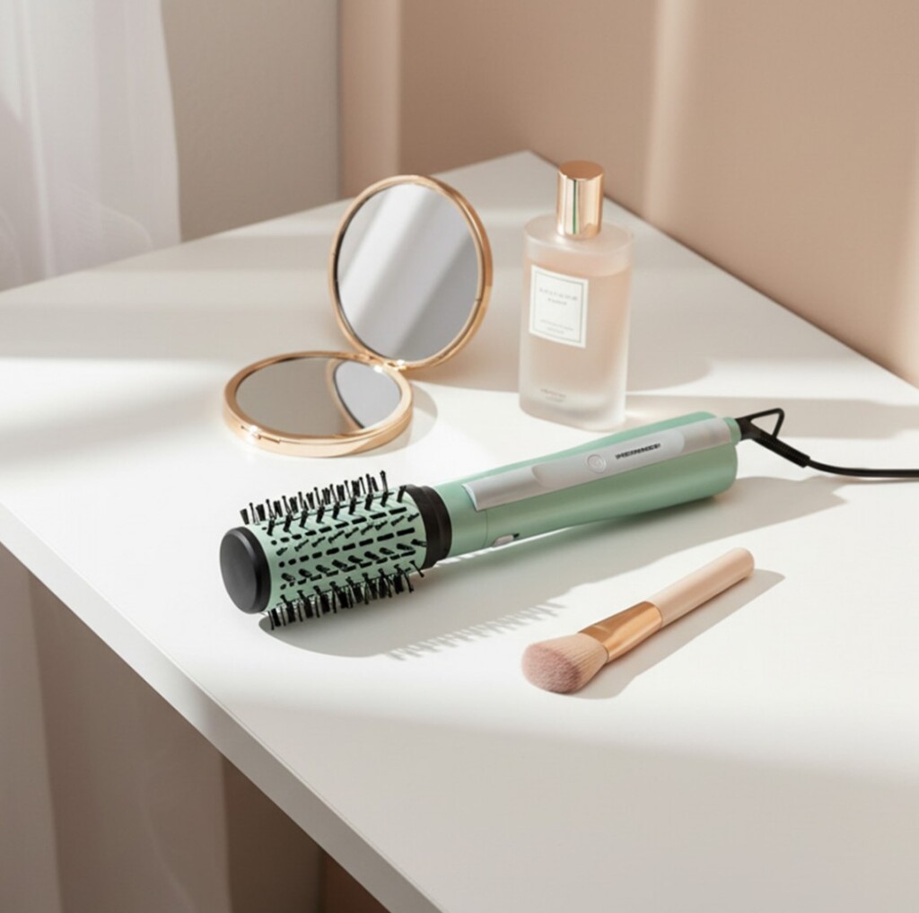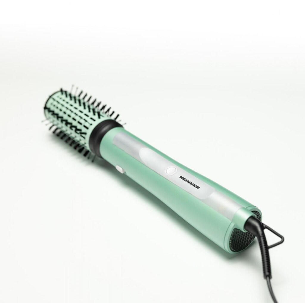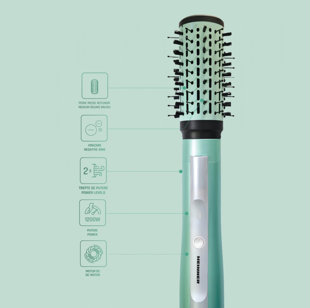 Perie cu aer cald Heinner HAB-Y12DC-GR1, motor DC, putere: 1200 W, 2 trepte de putere, ionizare, perie rotunda medie, culoare: verde cu alb.