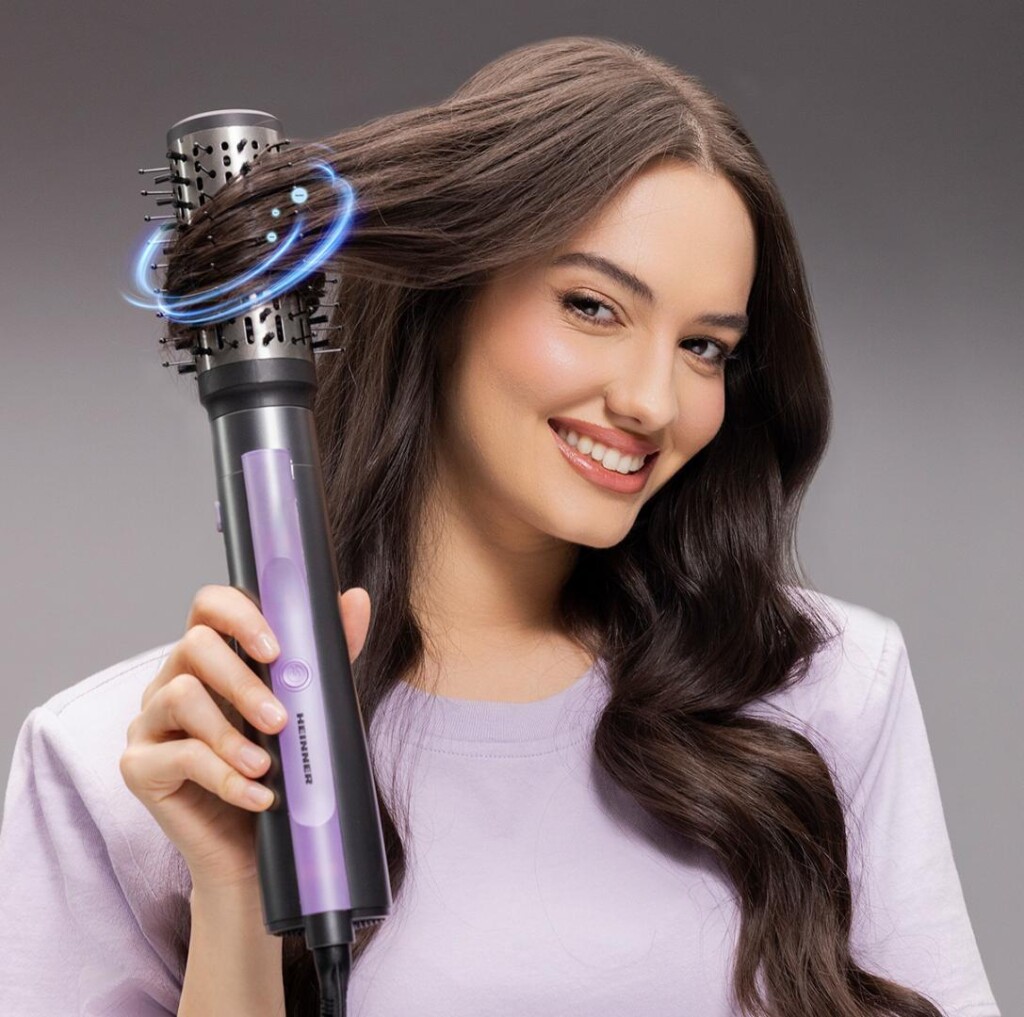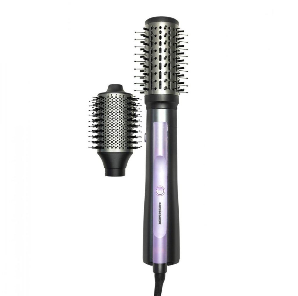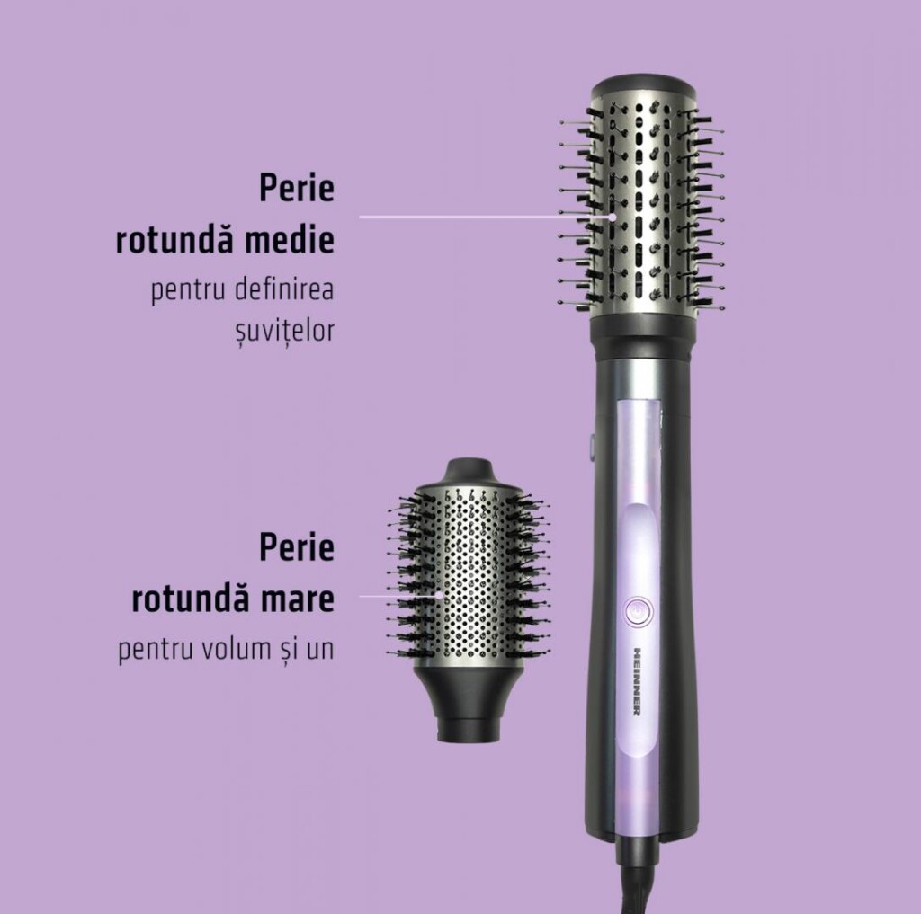 Perie cu aer cald Heinner HAB-Y12DC-GY2, motor DC, putere: 1200 W, 2 trepte de putere, ionizare, accesorii: perie rotunda mare, perie rotunda medie, culoare: gri cu mov.