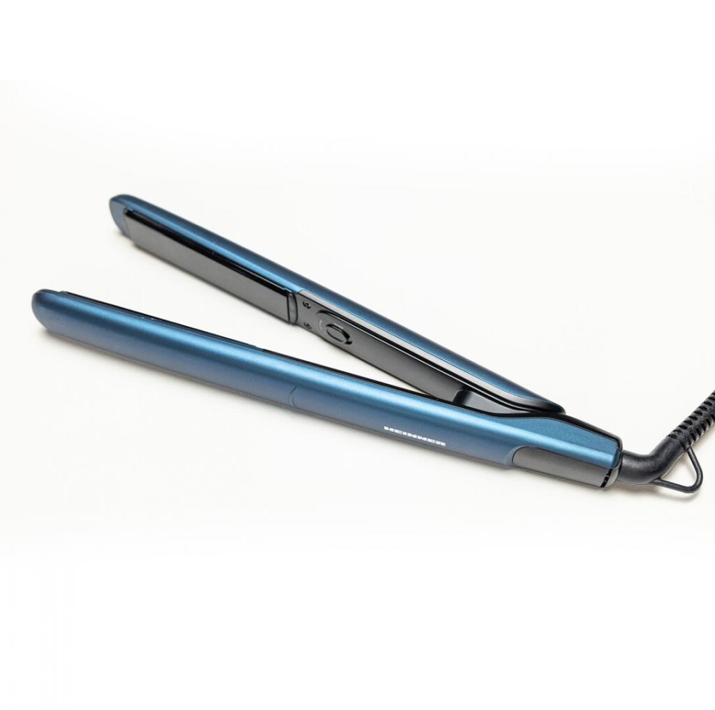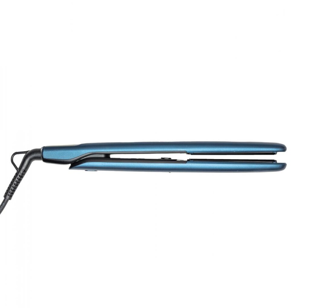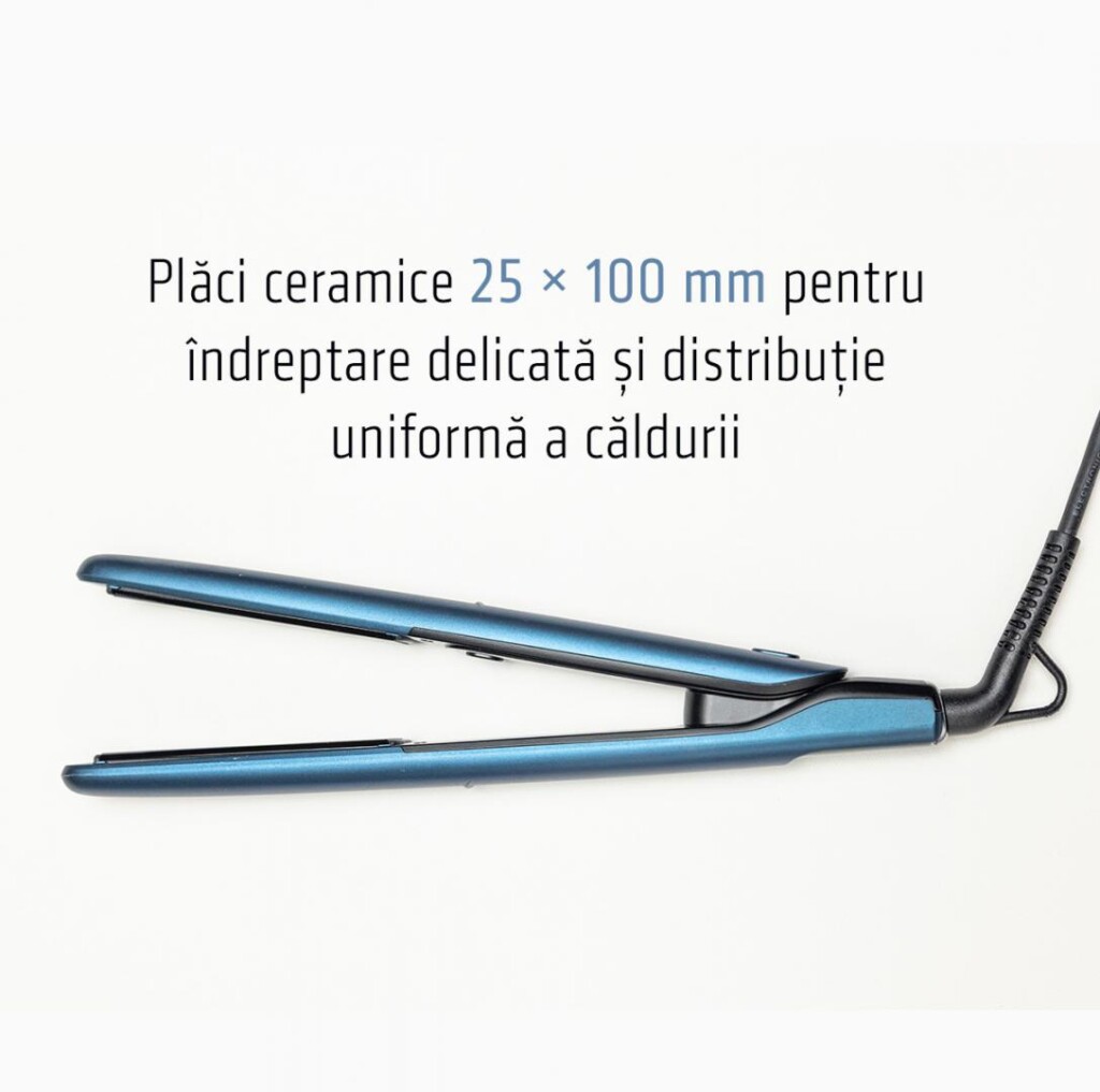 Placa de par Heinner HHS-Y200-BL, placi cu invelis ceramic: 25 x 100 mm, indicator LED, incălzire rapida si sigura, control precis al temperaturii, temperatura maxima: 200℃, comutator blocare placi, putere: 27-33 W, culoare: albastru.