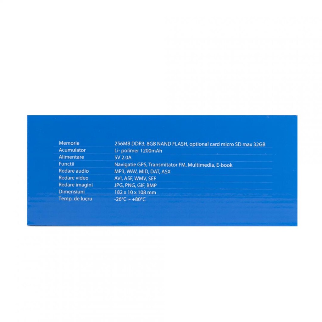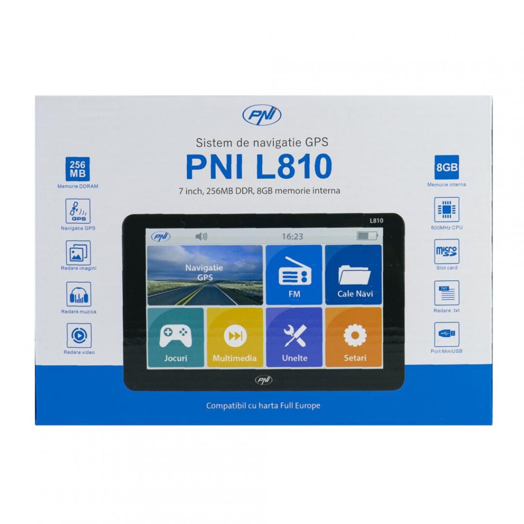 PNI L810 SISTEM NAVIGATIE 7″, Windows CE 6.0, Rezolutie: 800 x 480, Aspect: 16:9, Procesor: 800 MHz. Meemrie RAM 256 Mb, Memorie interna: 8Gb, Slot MicroSD, max 32Gb, Culoare Negru, FM Transmitter, Fara harti incluse.