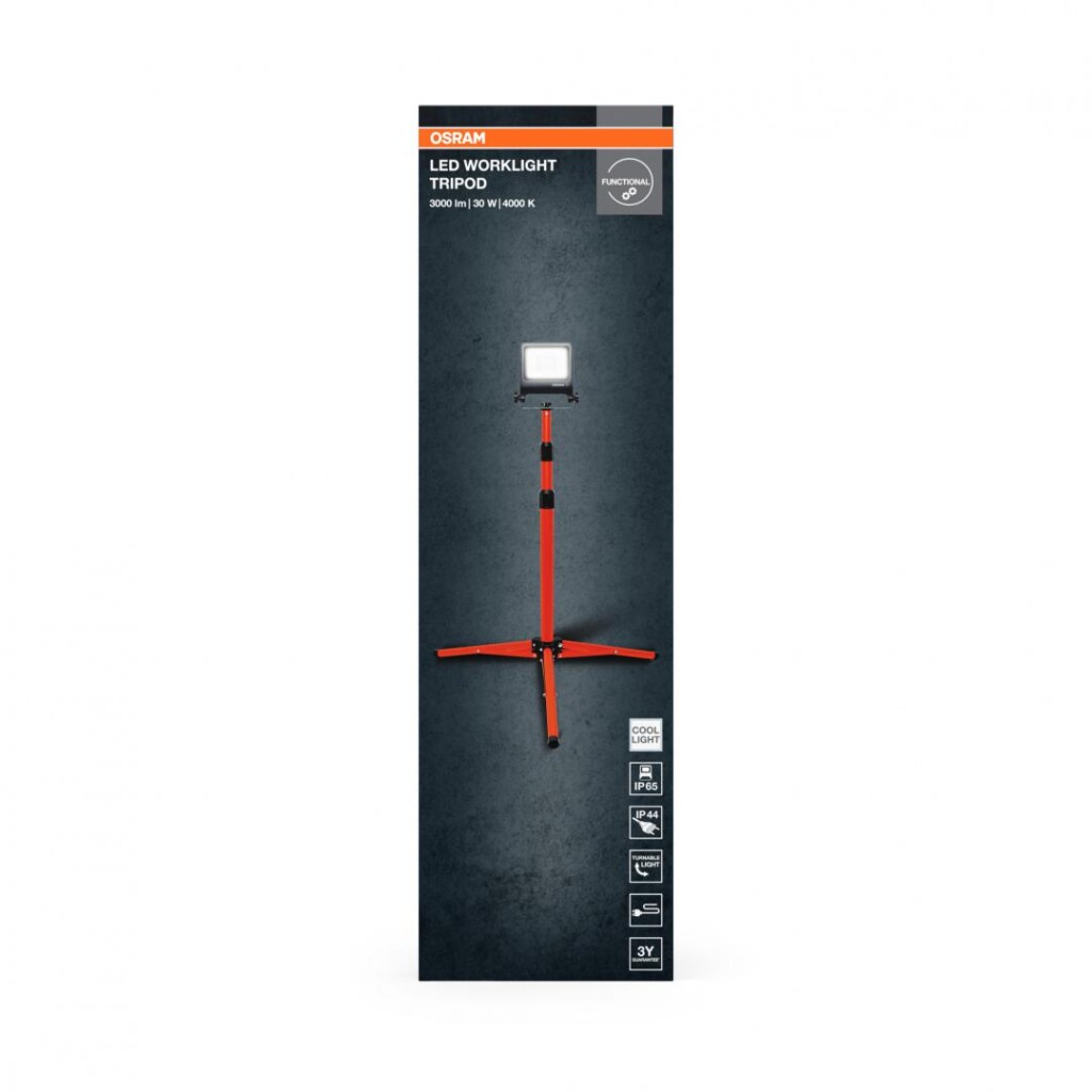 Proiector LED (lampa de lucru) cu stativ OSRAM Worklight Tripod, 30W, 220-240V, 2700 lm, lumina neutra (4000K), IP65/IK06/IP44, inaltime ajustabila 1.8m, Aluminiu.