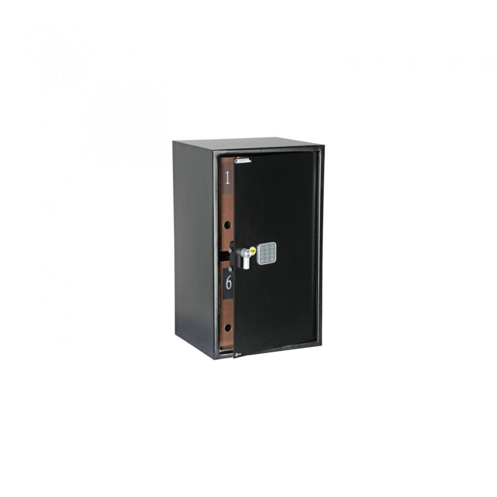 Seif Yale standard mare birou YSV/695; Livrare cu 2 chei; Raft ajustabil pentru obiecte mari; Depozit chei ajustabil, pana la 20 chei, Corp otel pregaurit, livrare cu bolturi fixare; Poate depozita laptop de 17″; Volum 89.2 litri; Usor de actionat tastatura digitala.