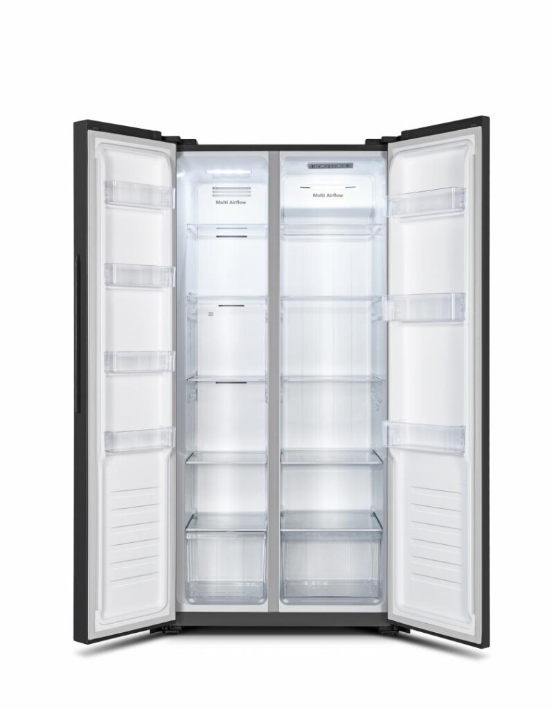 Side by side Heinner HSBS-441NFBKF+, Full No Frost, clasa energetica: F, control electronic cu display in interior, capacitate totala: 441L, capacitate frigider: 266L, capacitate congelator: 175L, lumina LED, functie Vacanta, functie Super congelare, 4 raf.