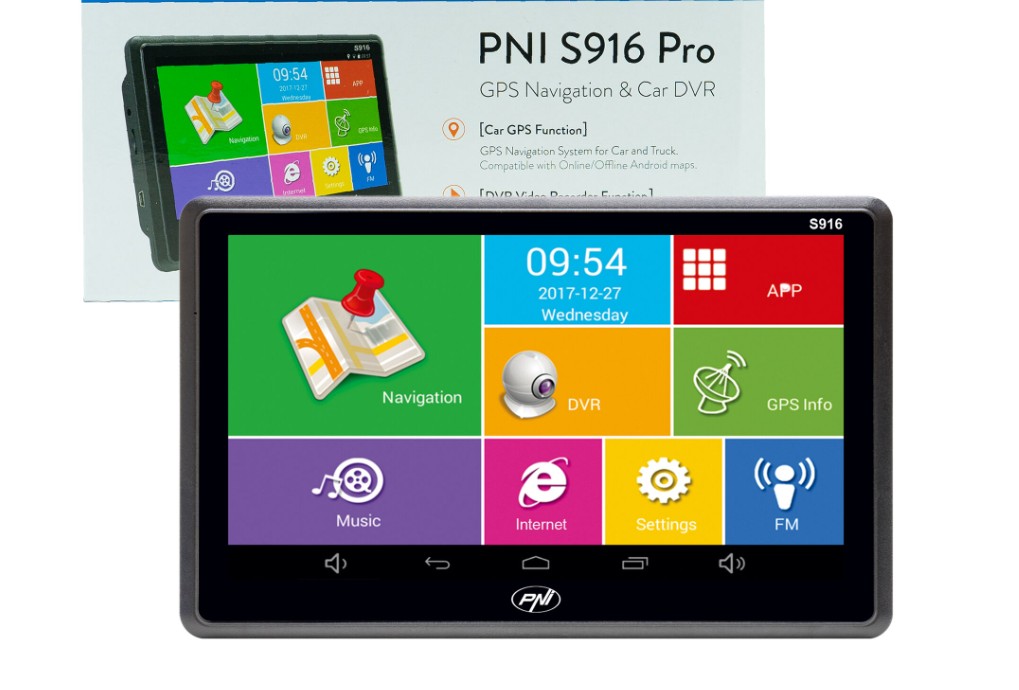 Sistem de navigatie GPS + DVR PNI S916 PRO ecran 7″ cu Android 6.0, memorie 16 GB, 1GB DDR3 RAM, Android 6.0, Toucscreen, Rezolutie: 800 x 480 pixeli, Procesor: 1.3 GHz, Slot card: Micro SD, FM transmitter, Acumulator 2000 mAh.