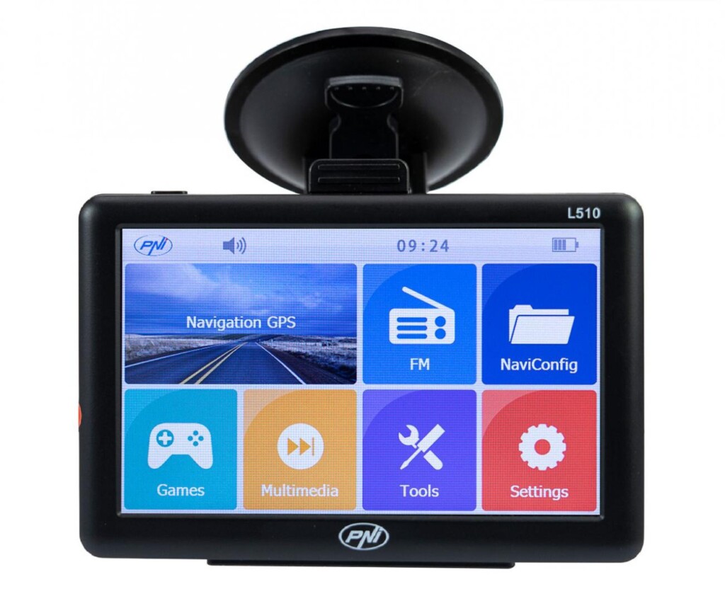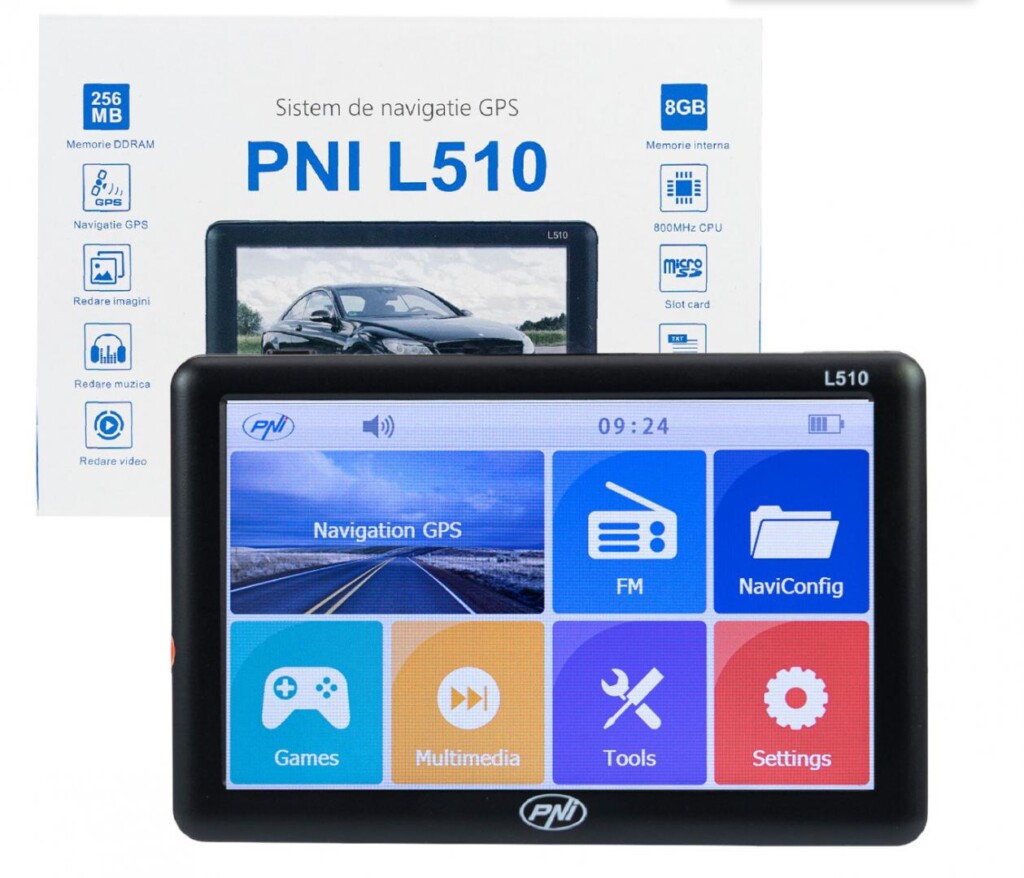 Sistem de navigatie GPS PNI L510 ecran 5″, 800 MHz, 256MB DDR2, 8GB memorie interna, FM transmitter, Sistem de operare: Windows CE 6.0, Rezoluţie ecran: 800 x 480 pixeli, Aspect ecran: 16:9, Procesor: 800Mhz, fara harti incluse.