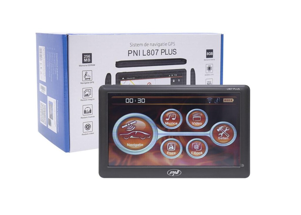 Sistem de navigatie GPS PNI L807 PLUS ecran 7″, 800 MHz, 256MB DDR, 8GB memorie interna, FM transmitter, Sistem de operare: Windows CE 6.0, Touchscreen, Rezoluţie ecran: 800 x 480 pixeli, Frecvenţă procesor: 800 Mhz, Card SD/MMC maxim: 32GB, Acumulator incorporat: 1600 mAh.