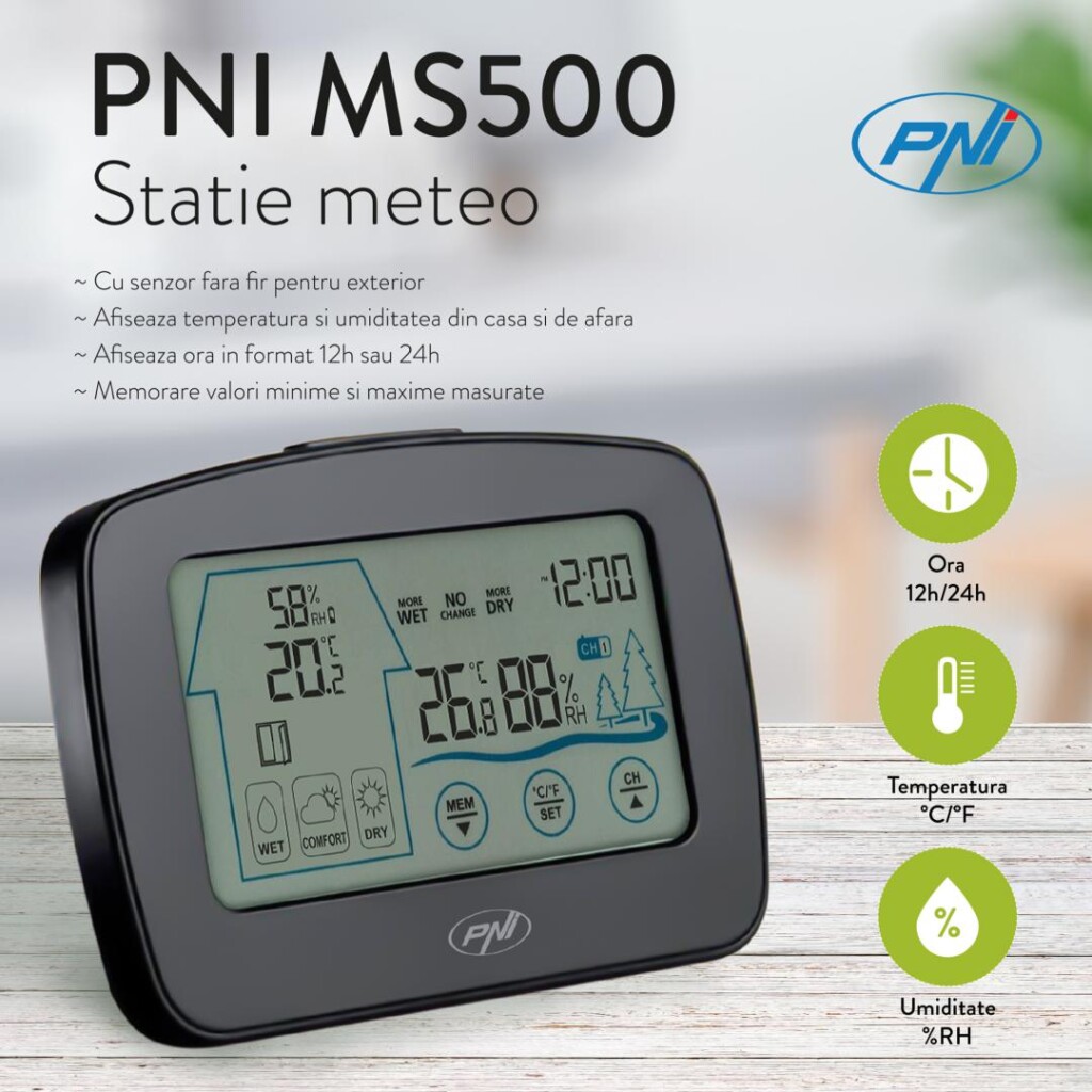 Statie meteo PNI MS500 cu senzor extern fara fir, afiseaza temperatura si umiditatea interioara si exterioara, memorie valori climaterice minime si maxime, Alimentare: 3 x baterii AAA 1.5V, Interval masurare: -9.9°C ~ +50°C / +14°F ~ +122°C, Interval masurare umiditate: 20% ~ 95%RH, Afisare ora, Caracteristici senzor extern: 2 x baterii AAA 1.5V, Interval masurare: -40°C ~ +60°C / -40°F ~ +144°C, Interval masurare umiditate: 20% ~ 95%RH, Frecventa comunicare radio: 433MHz, Distanta de comunicare: 50M, Clasa de rezistenta la apa: IPX4 (stropiri cu apa).