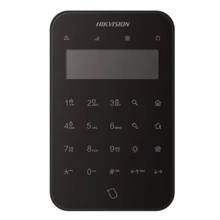 Tastatura wireless LCD AX PRO Hikvision DS-PK1-LT-WE/BK, 868MHz two-way Tri-X wireless technology; distanta comunicare RF: 1200m camp deschis; stay/away arm, disarm, silent alarm, output control; complet configurabil la distanță prin APP; baterii: 4 x CR123 incluse, durata de viata a bateriei: 2 ani, culoare: negru, dimensiuni: 174.63 mm × 109.62 mm × 25.25 mm, greutate: 348g.