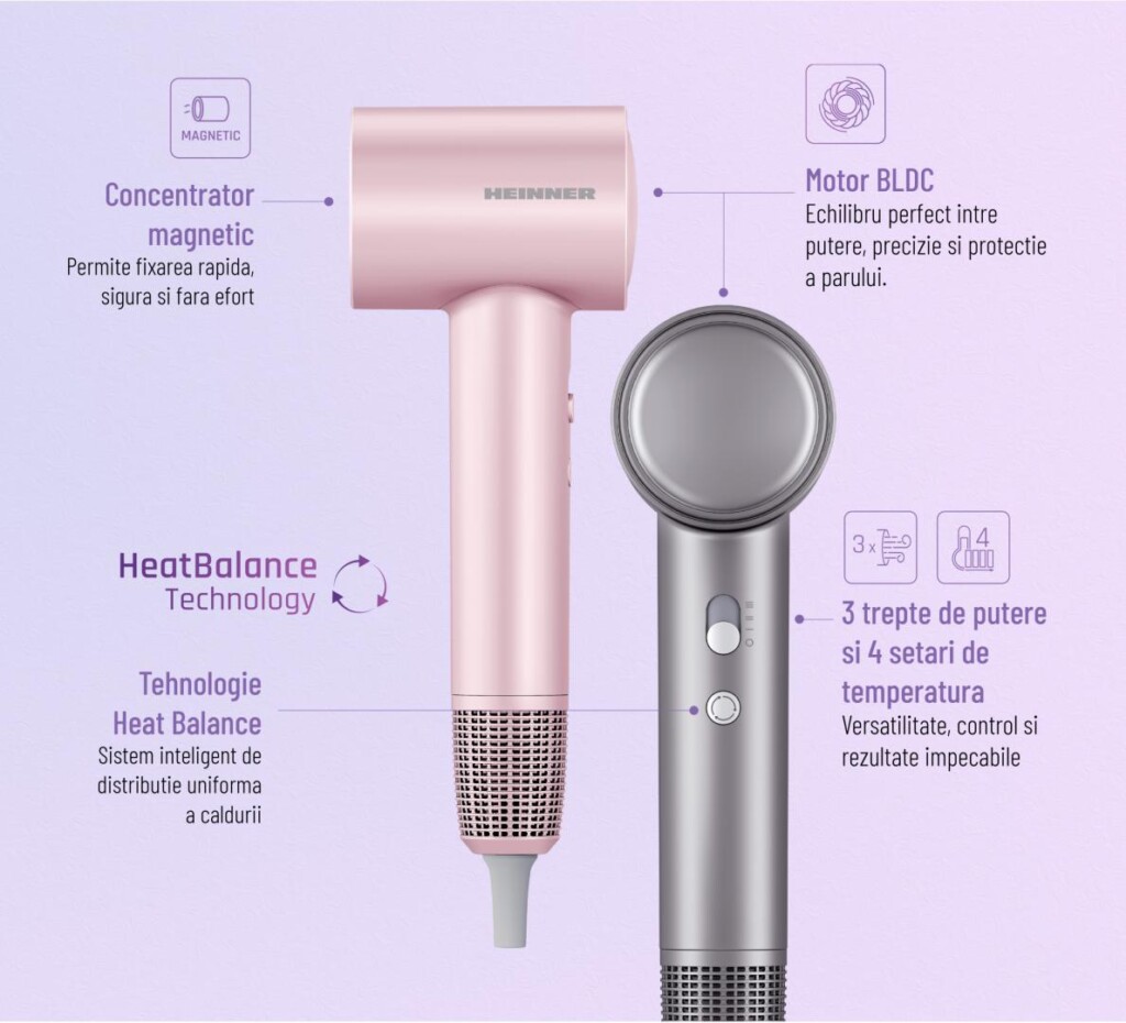 Uscator de par Heinner HHD-H16BLDC-PNK, Tehnologie Heat Balance, ionizare, motor BLDC, putere: 1600 W, 3 trepte de putere, 4 setari de temperatura, concentrator magnetic, culoare: roz.