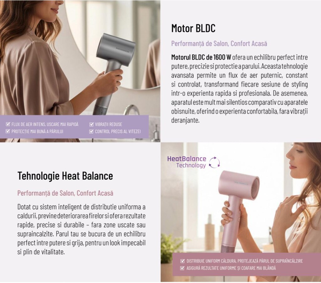 - Functii: Ionizare Tehnologie Heat Balance Motor BLDC 3 trepte de putere 4 setari de temperatura