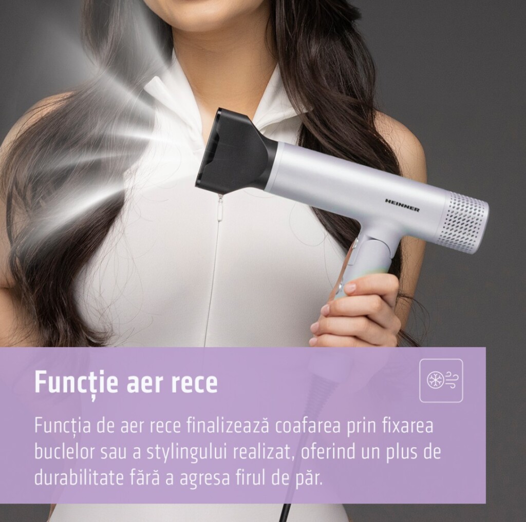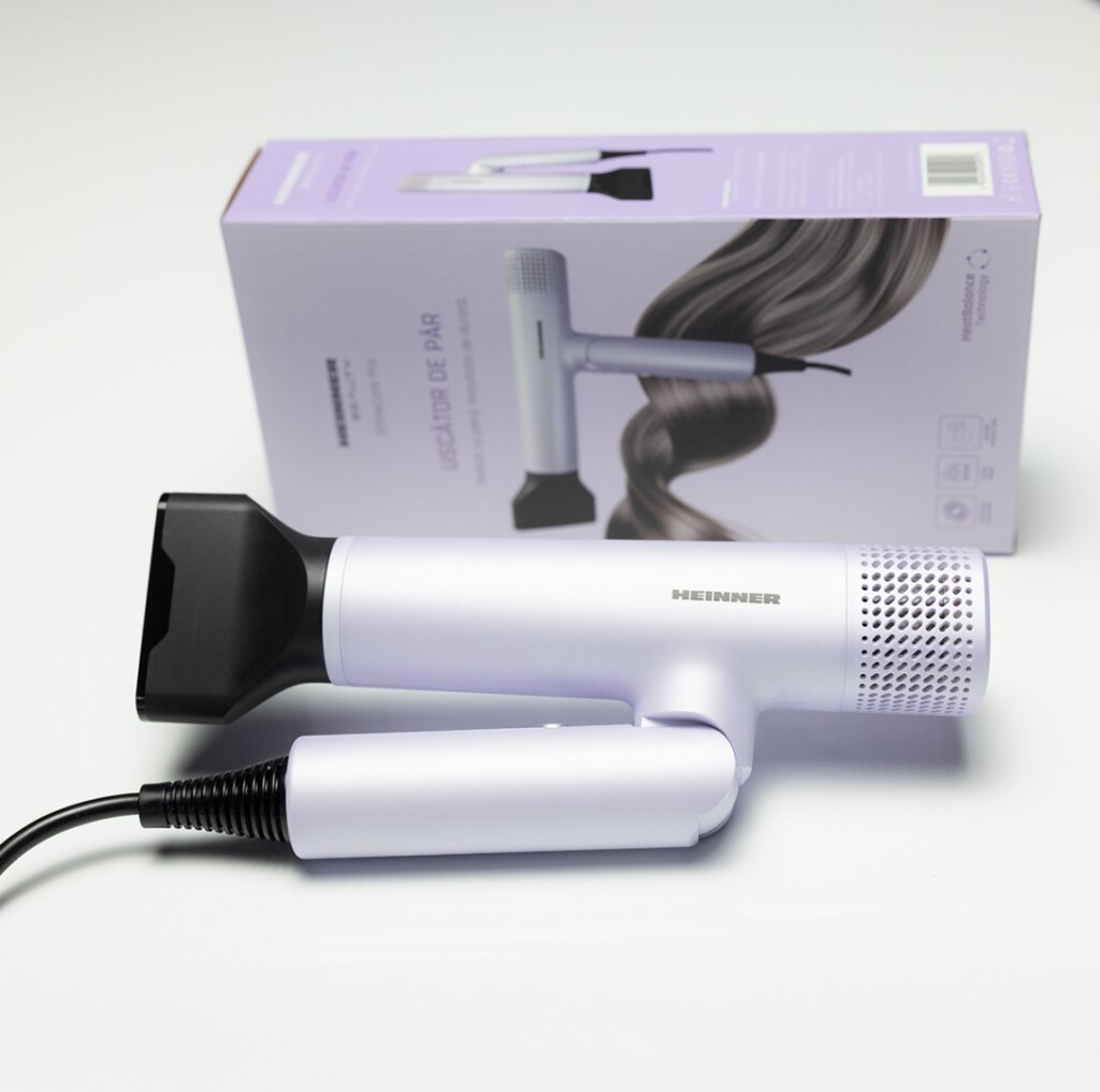 Uscator de par Heinner HHD-Y16BLDC-LV, Motor BLDC, putere: 1600 W, 2 trepte de putere, 3 setări de temperatura, ionizare, functie aer rece, maner pliabil, accesorii: concentrator, protectie filtru detasabila, culoare: mov.