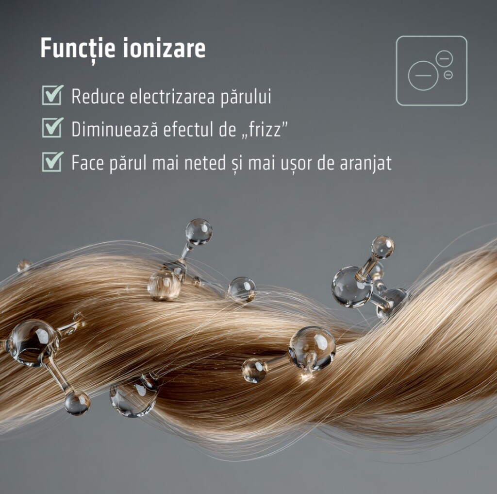 - Functii: Ionizare Functie aer rece Motor BLDC Maner pliabil