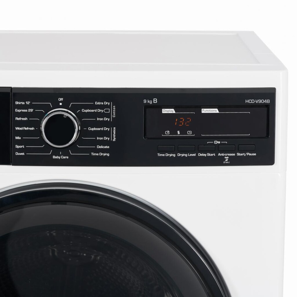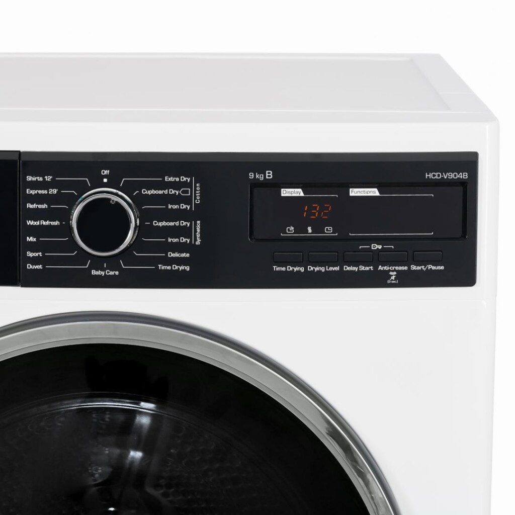Uscator de rufe cu condensare Heinner HCD-V904B, Capacitate incarcare 9kg, Clasa energetica B, 15 programe de uscare, Design elegant cu panel negru si usa cromata, Display LED, Program rapid camasi 12 min, Program expres 29 min, Program Baby Care, Functie Start intarziat, Functie anti-sifonare, Lumina cuva, Selector nivel uscare, Indicator curatare filtru scame, Indicator rezervor colectare apa plin, Blocare acces copii, Dimensiuni (LxAxI): 59.6×60.9×84.5 cm, Culoare: Alb.