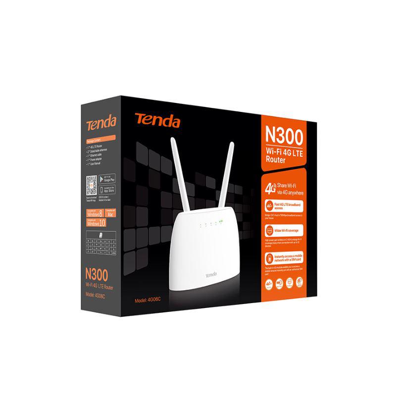 Wireless Router Tenda, 4G06C; N300 wireless LTE router, Fast Ethernet, Single-band (2.4 GHz) 4G/3G standards: FDD LTE, TDD-LTE, WCDMA, 4G Cartgory: LTE CAT4, Max 4G speed: DL:150Mbps, UL:50Mbps, Wi-Fi standards: 802.11b/g/n, Wi-Fi frequency: 2.4GHz, Wi-Fi speed: 2.4GHz: 300Mbps, Interface: 1 × 10/100 Mbps LAN/WAN Port, 1 × 10/100Mbps LAN Port, 1 × 2FF SIM Card Slot, 2 detachable 4G/3G Antennas, 2 Internal Wi-Fi Antennas.